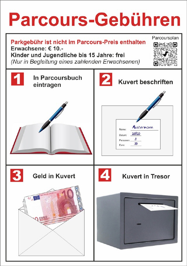 - Parkgebühr von € 2,- (4 Stunden) oder € 3,- (ganzer Tag) MUSS am Parkautomat zusätzlich zur Parcours-Gebühr IMMER bezahlt werden. Die Parkgebührt ist nicht im Parcours-Preis inkludiert!